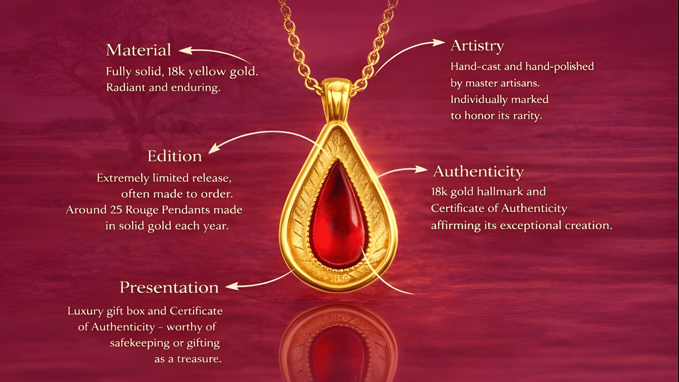 Choosing the Rouge Pendant in 18k solid gold is an investment in lasting luxury and profound personal significance. You will love not only the opulent weight and feel of solid gold against your skin, but also what this pendant represents every time you wear it. It’s a powerful conversation piece – elegant and understated in design, yet steeped in symbolism that resonates deeply. Owning this piece now means owning a slice of Maison DORAMS’ legacy: this is one of a very limited number of solid gold Rouge Pendants ever to be created. By securing yours, you join an exclusive circle of collectors who value meaning over mass production. Practically, the value of 18k gold offers peace of mind; this pendant holds intrinsic value and can be passed down as a precious heirloom, growing in sentimental value with each generation. Culturally and emotionally, Rouge in solid gold lets you wear astory of feminine resiliencein the most luxurious way possible. You’ll feel a connection to heritage and empowerment whenever you clasp it around your neck – a reminder thatlegacy isn’t loud; it glows quietly and eternally. If you desire jewelry that goes beyond beauty to capture your ideals and can accompany you for a lifetime, the Rouge Pendant in solid gold is a choice you will cherish every day you own it.